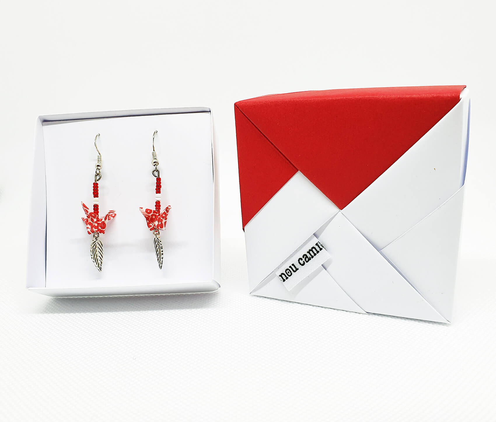Les boucles d’oreilles sont présentées dans un joli écrin fait-main conçu et réalisé par Nou Cami.